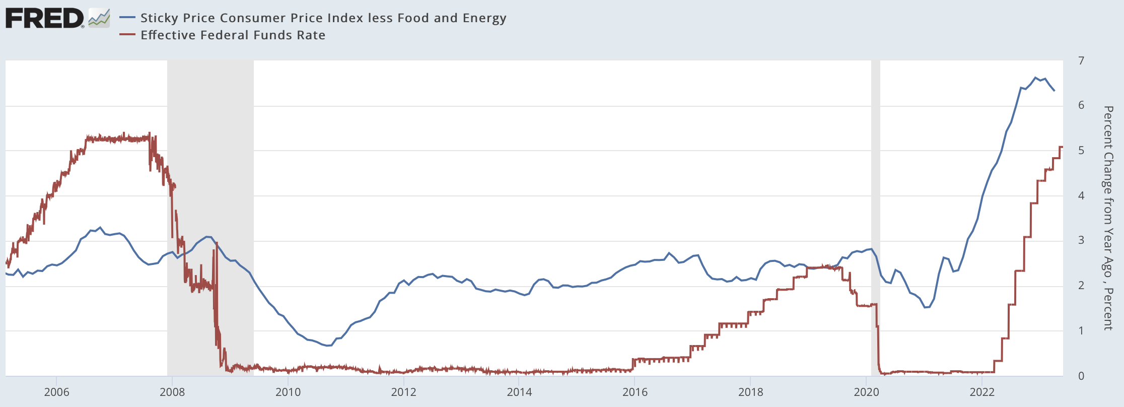 - The Sticky Price CPI (blue line) tracks a subset of goods and services that change price infrequently. Insurance, healthcare, and food away from home are a few examples of inputs.